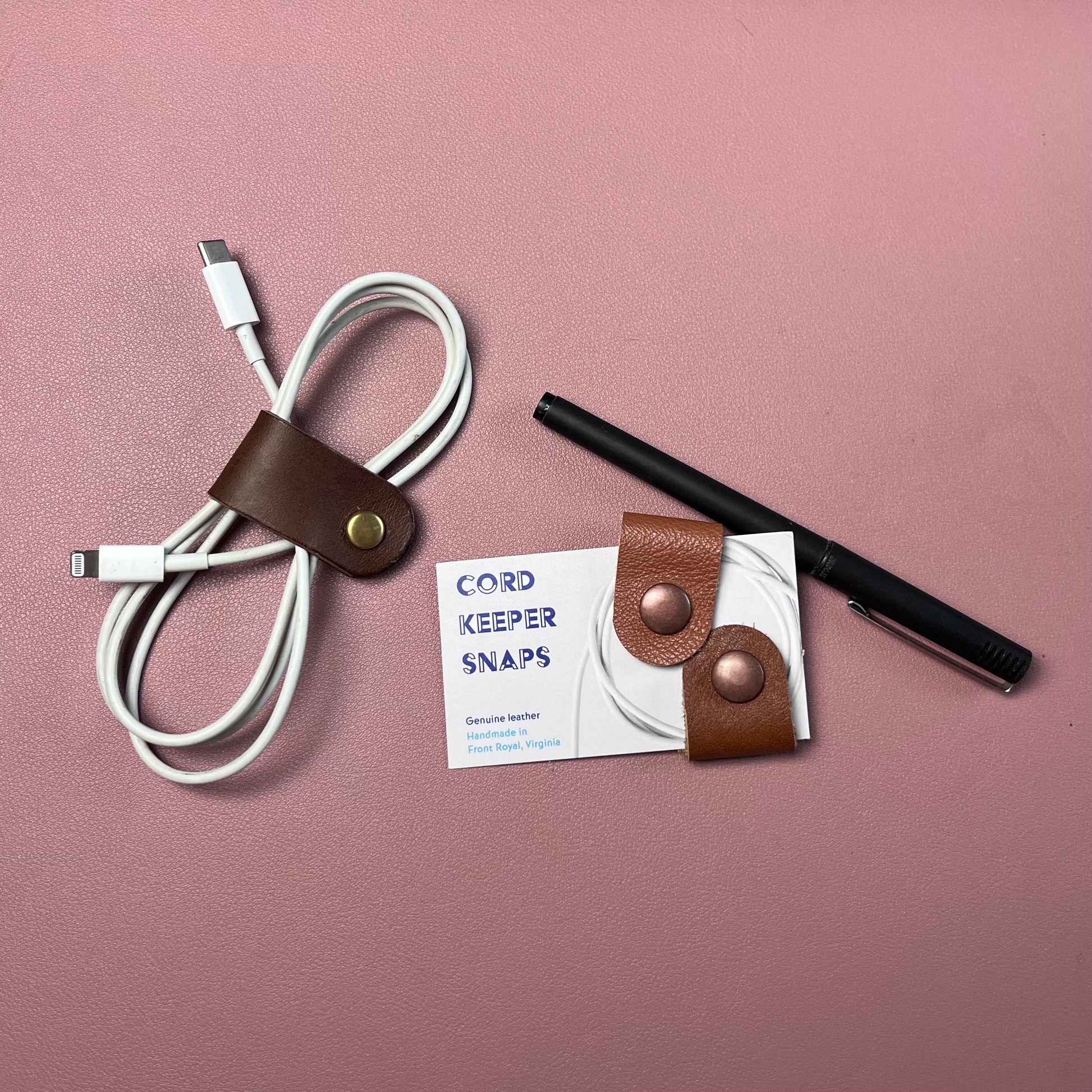 Keep your cords neat and tangle-free with these leather Cord Keeper Snaps, handcrafted in Front Royal, Virginia. Each snap adds a touch of charm while securely wrapping your cords, making it easy to organize everything from headphones to chargers. Durable and stylish, they’re perfect for keeping your workspace or bag clutter-free with a bit of personality. Say goodbye to messy cords and hello to effortless organization!